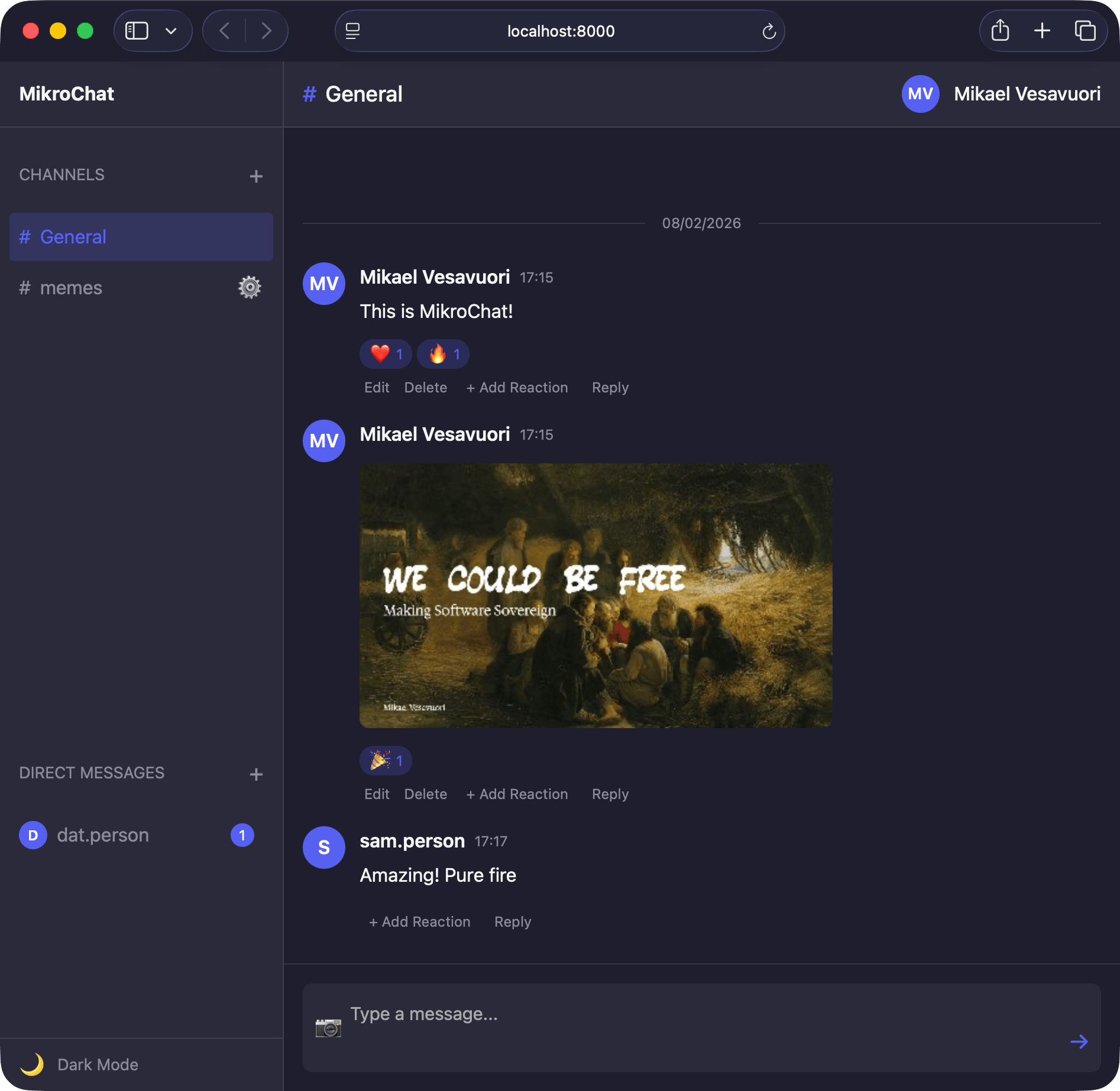 MikroChat gives your team channels, threads, direct messages, and real-time updates without sending your conversations through someone else's servers.